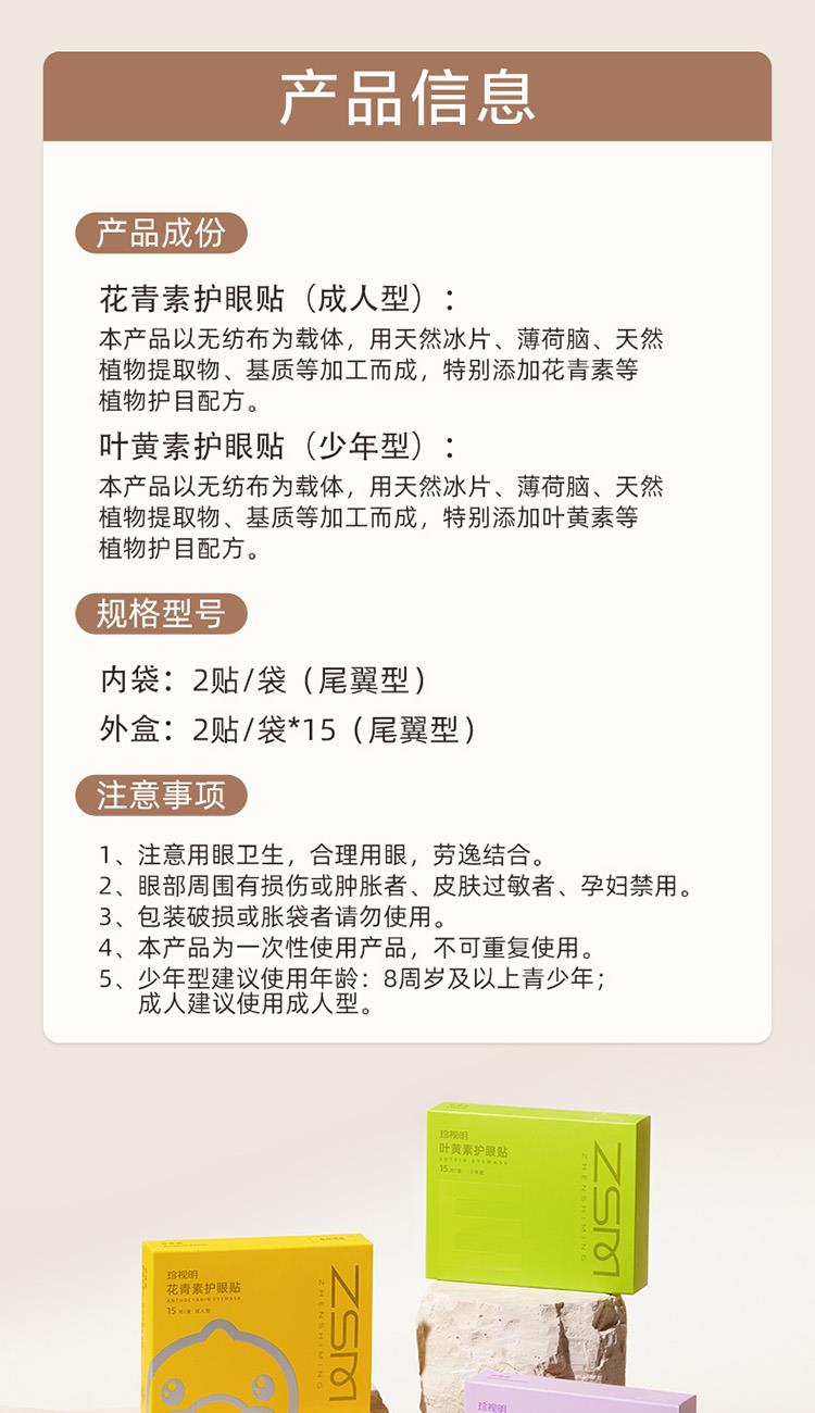 規格: 15對/盒 內袋2貼/袋(尾翼型) 外盒:2貼/袋*15(尾翼型) 商品毛重:169.00g 本產品以無紡布為載體,用天然冰片、薄荷腦、天然植物提取物、基質等加工而成,特別添加葉黃素等植物護目配方。