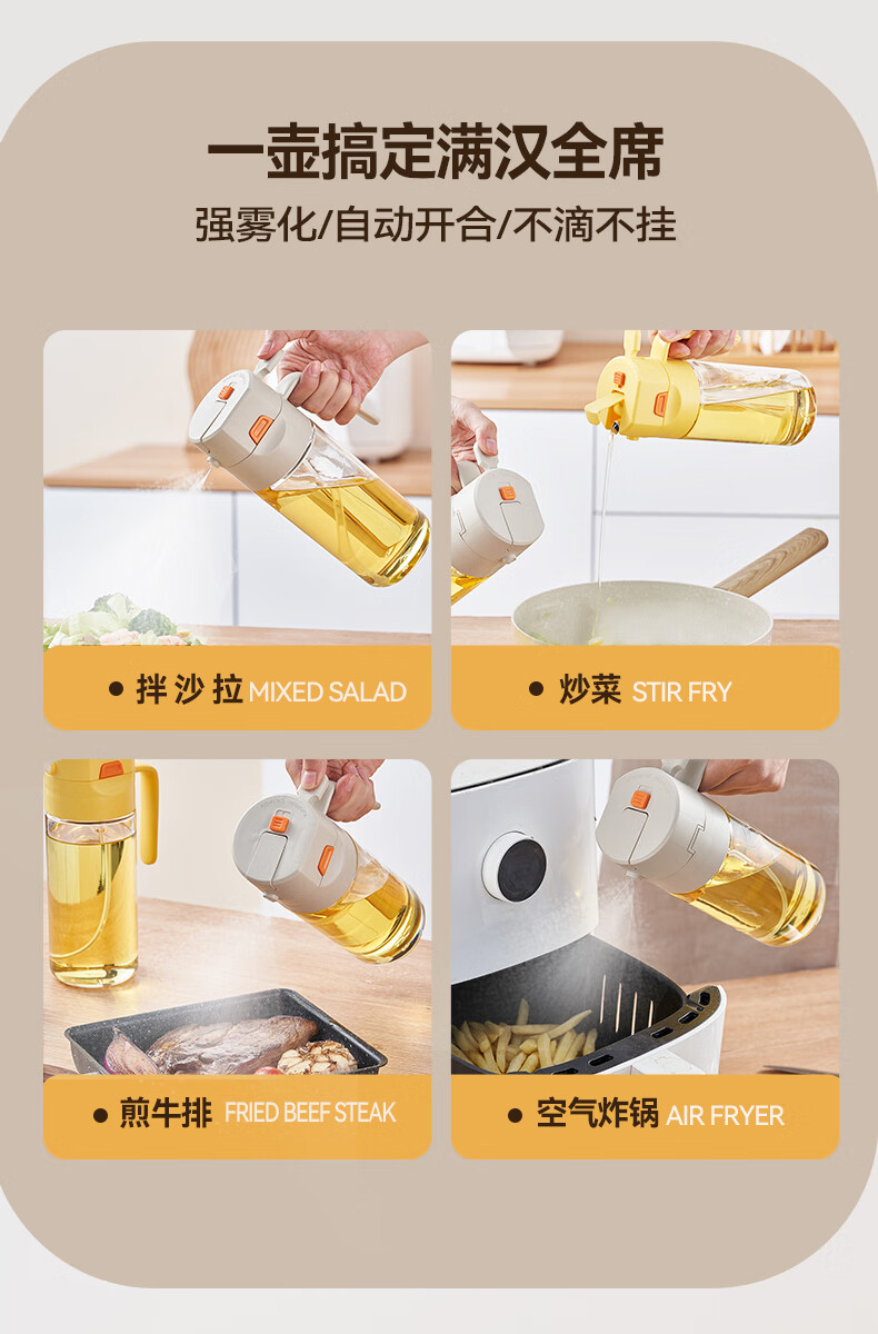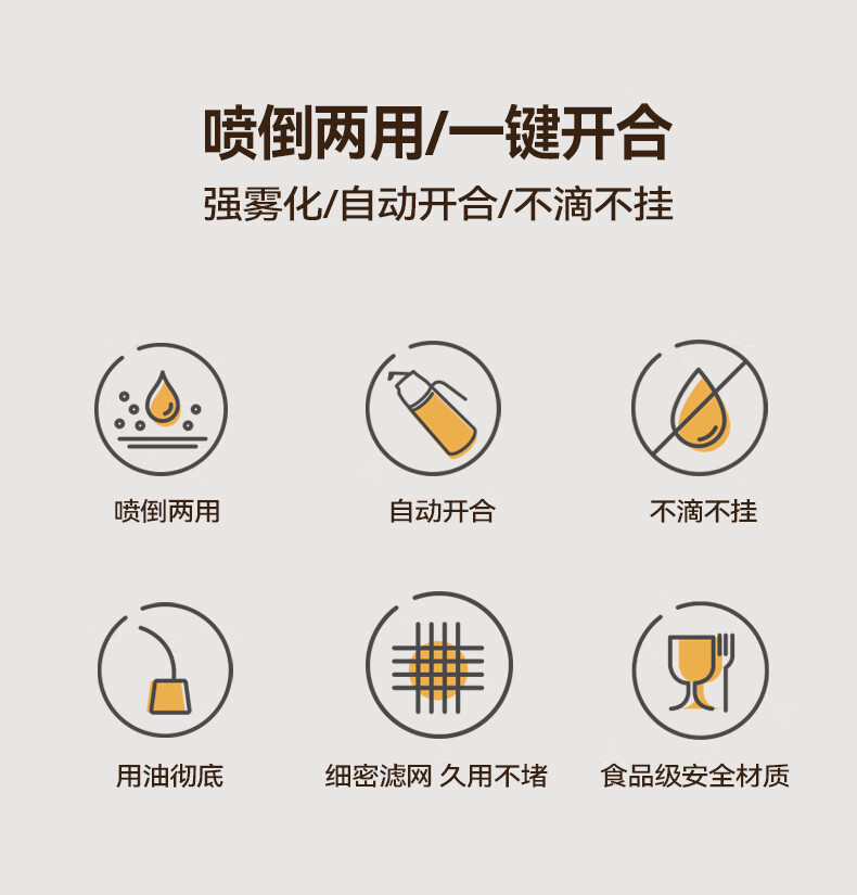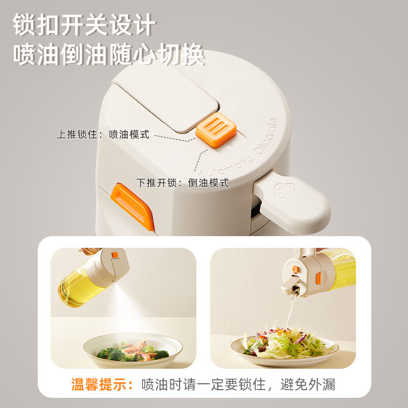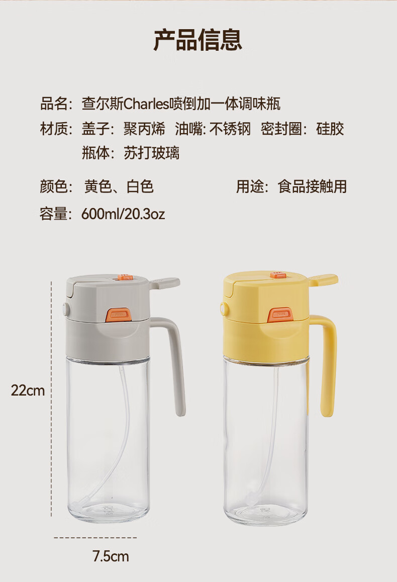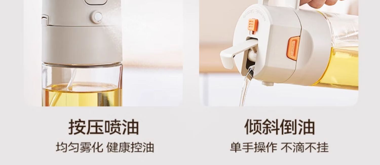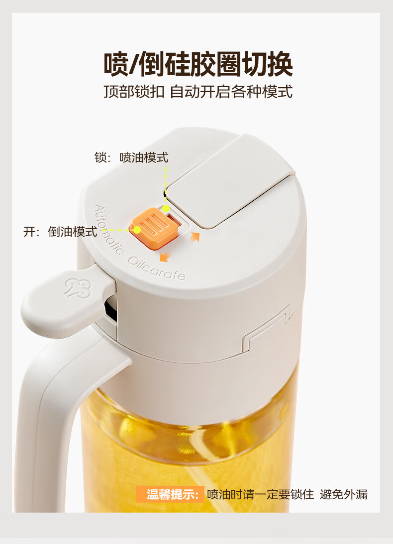 快捷加油 噴倒一體 Charles查爾斯動力噴油壺 一壺搞定滿漢全席,強霧化/自動開合/不滴不掛 按壓噴油 均勻霧化 健康控油,傾斜倒油 單手操作 不滴不掛 3D立體廣角噴霧,一次噴霧0.15g 細密霧化 一鍵開蓋一秒加油,大口徑倒油 單手輕松倒油 偏芯設計 細密濾網 底部濾網設計,不會阻塞油嘴 加厚硅膠圈設計,厚實不漏油 噴/倒硅膠圈切換 頂部鎖扣 自動開啟各種模式